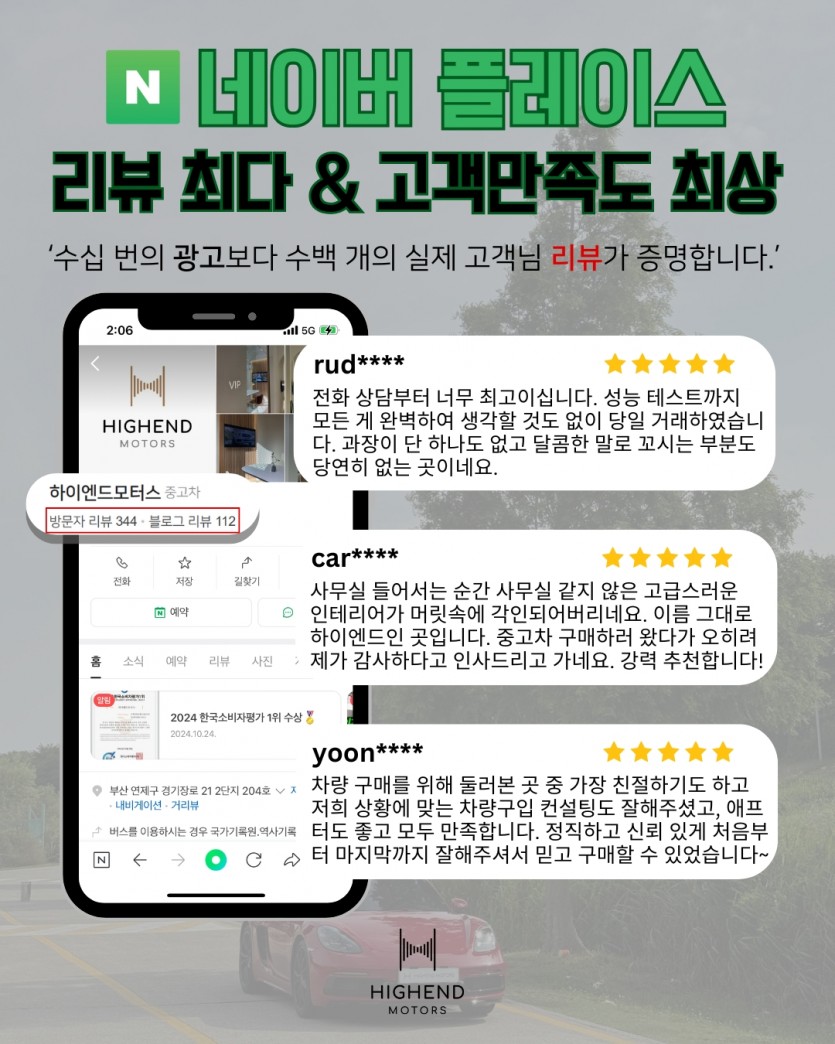 하이엔드모터스를 직접 경험한 고객님들의 목소리를 네이버 플레이스에서 확인해보세요